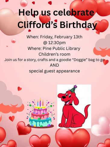 Calling all kids come join us for Clifford's birthday. We will sing songs, do a craft and more.